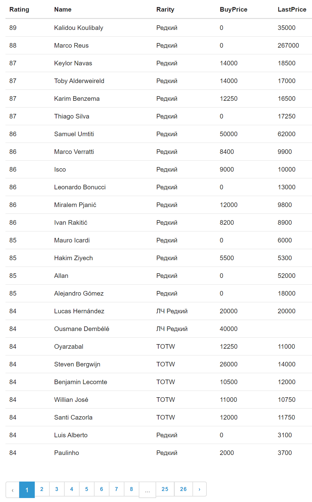 Для каждой карточки отображается ее цена, время ее последнего обновления и источник - Futbin или обновление с самого приложения.