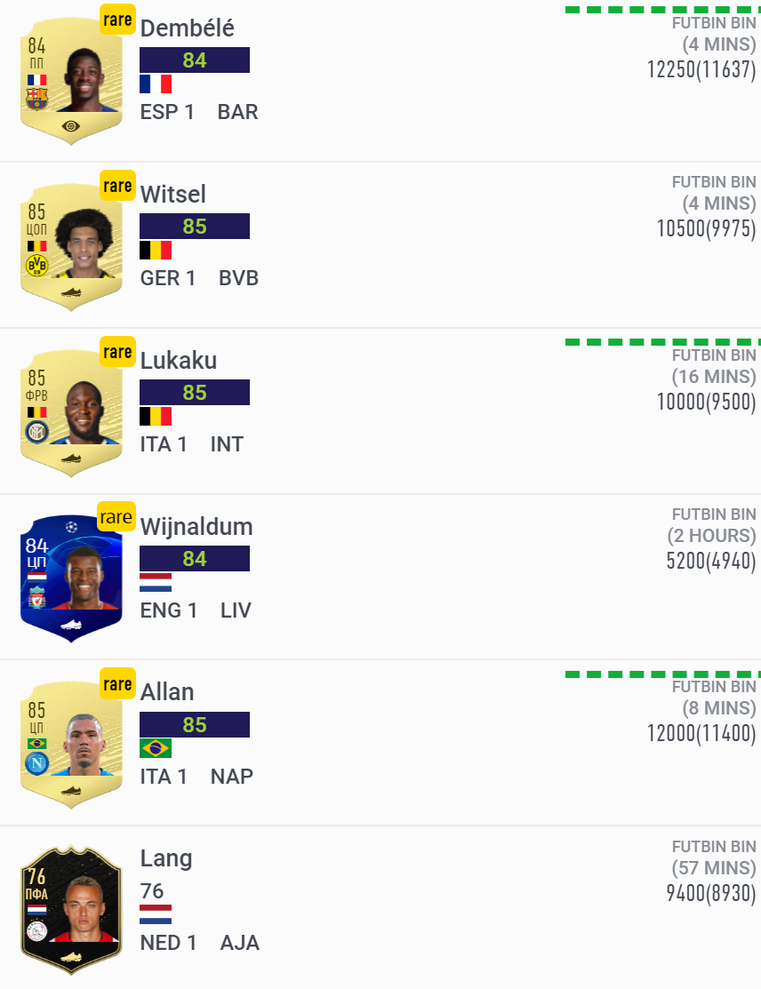 В случае, когда выполнен импорт клуба, для каждой карточки на рынке отображается вертикальная зеленая штрих-полоска, которая свидетельствует о том, что данная карта уже есть у вас в клубе.