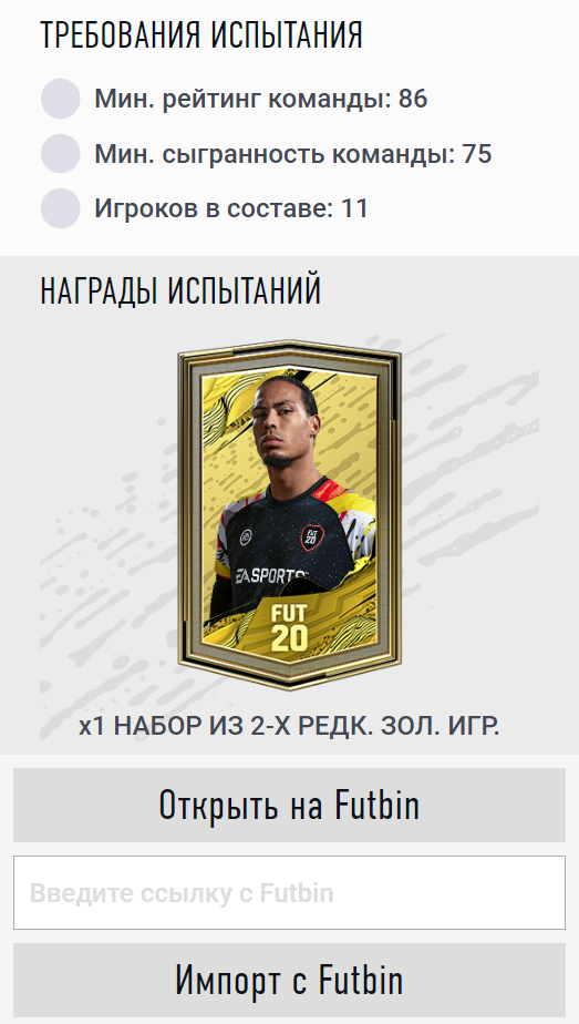Импорт состава SBC. Импортируй составы или готовые SBC c Futbin одним кликом.